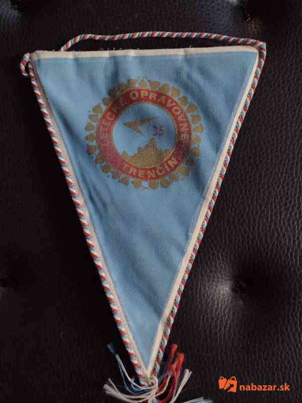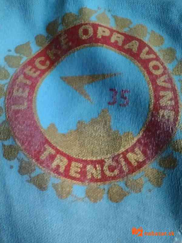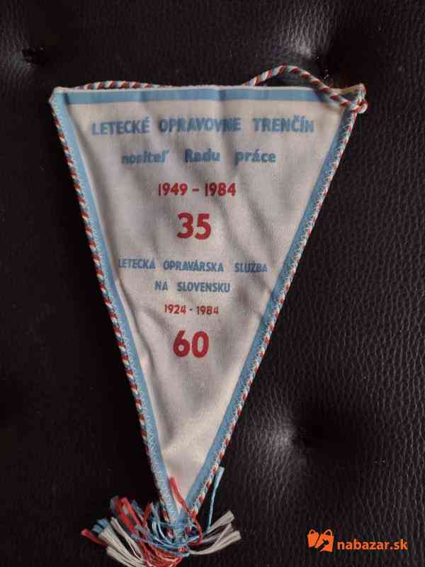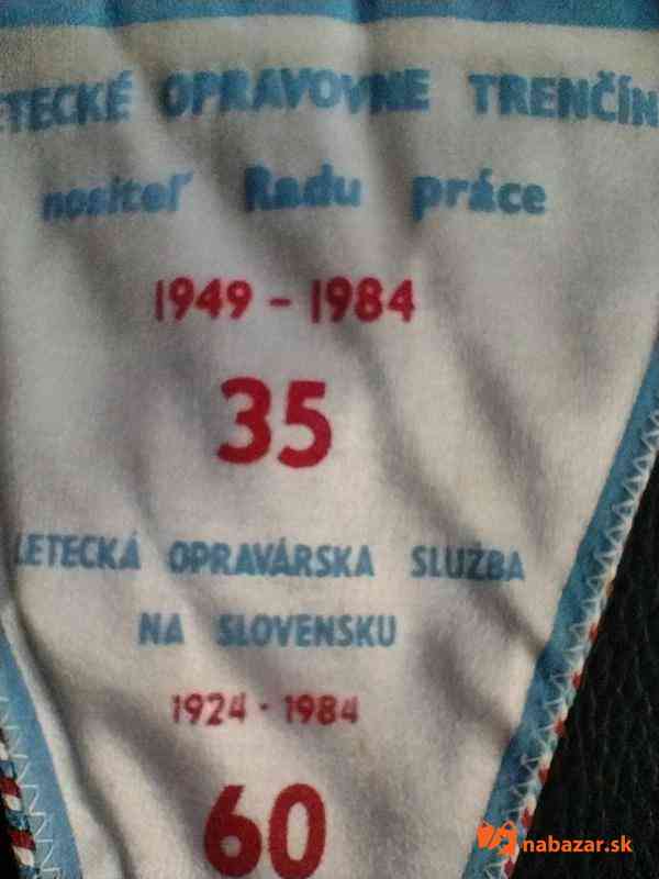 Zberateľská vlajočka vyrobená pri príležitosti 35 výročia udelenia titulu nositeľ Radu práce podniku Letecké opravovne Trenčín. Titul mu bol udelený v roku 1949.