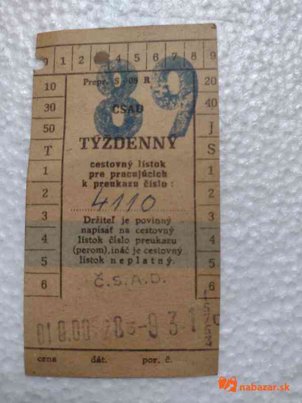 Týždenný lístok na autobus. Lístok slúžil na zľavy na cestovanie do zamestnania a zo zamestnania domov. Bola to veľká výhoda pre pracujúcich v ére socializmu. Je to zberateľsky zaujímavý artefakt.