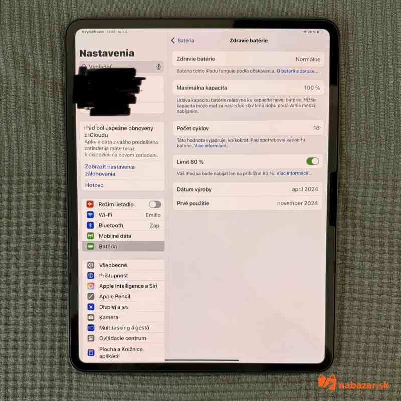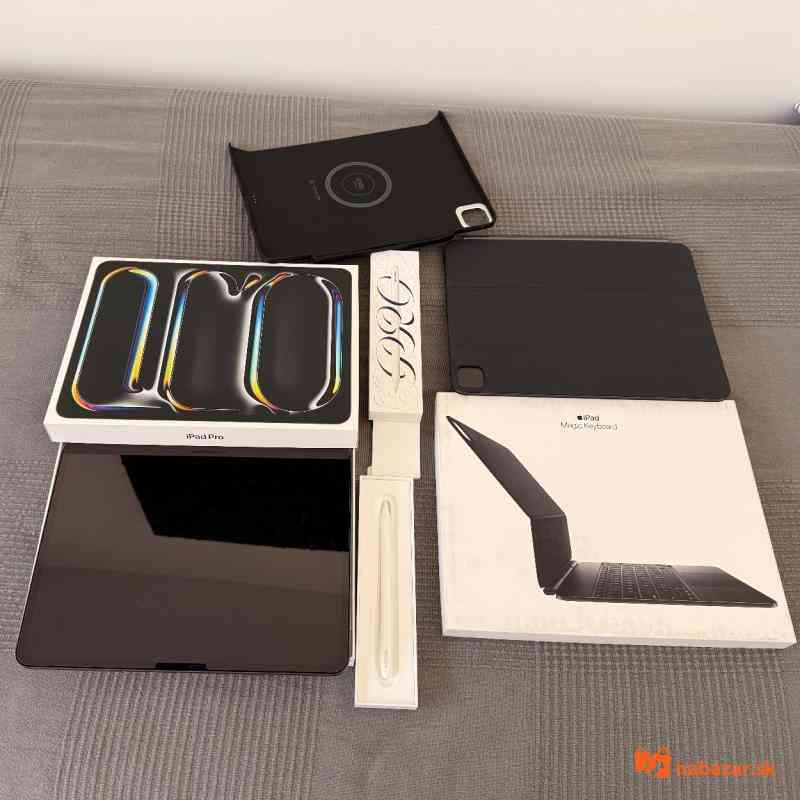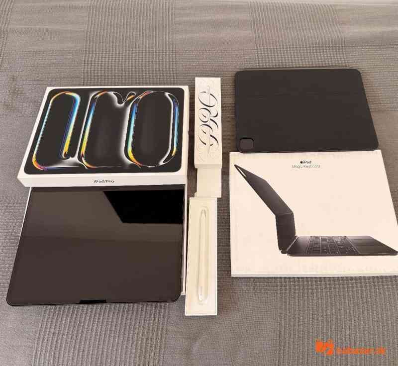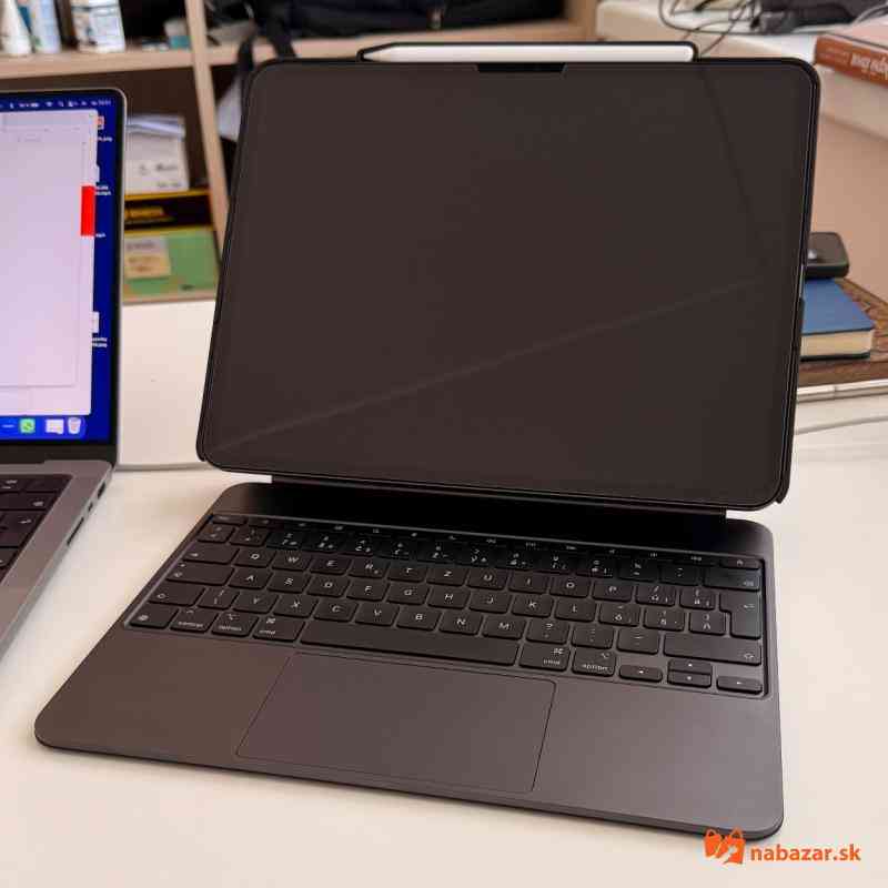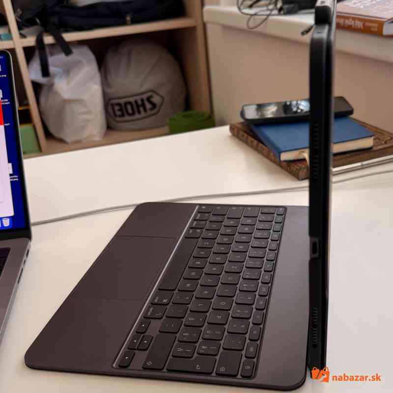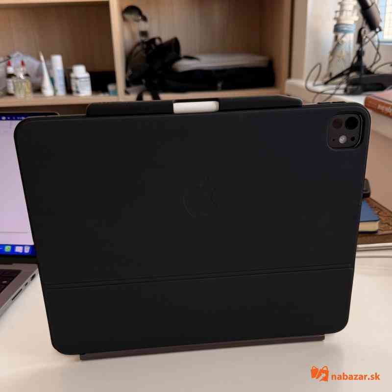 Apple iPad M4 2024 Wifi+SIM 256GB 13 palc, veľmi málo používany o čom svedčia nabíjacie cykly 18, v podstate nový a v záruke. K tomu obal s klavesnicou (magic keyboard) , obal Enzo, Apple Pen Pro , všetko originalne balenie a tiež doklad o kúpe