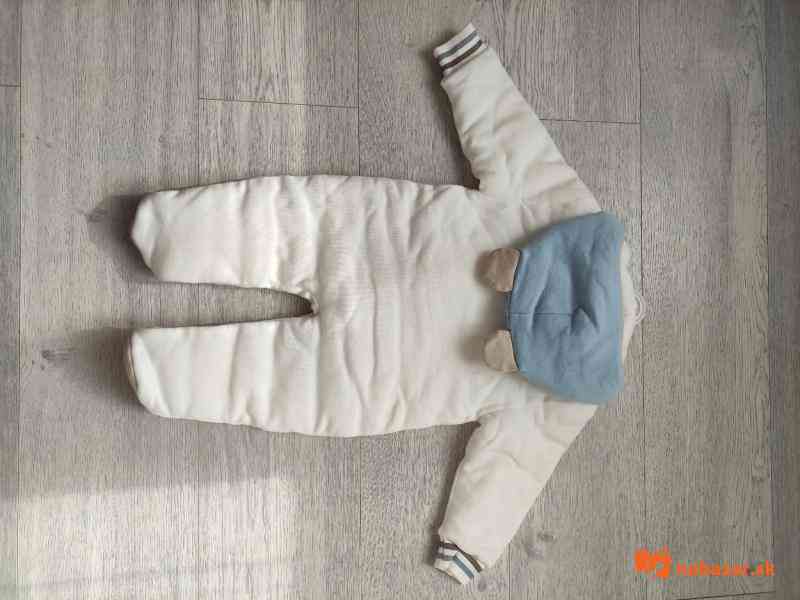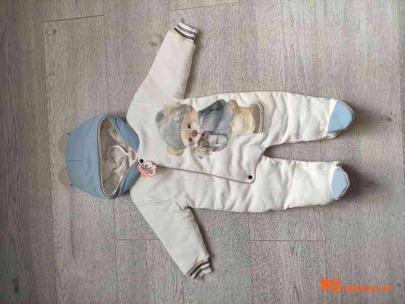 Nádherný overal s mackom, veľkosť 74, značka Sofija. PC 40 €. Overal je zateplený. Ale pozor má chybičku! Má 2 mini žlté bodky vo vnútri pri zapínaní a kým som šla po sáčok že ho odložím syn trochu dokázal zničiť visačku, vidno na poslednej foto.