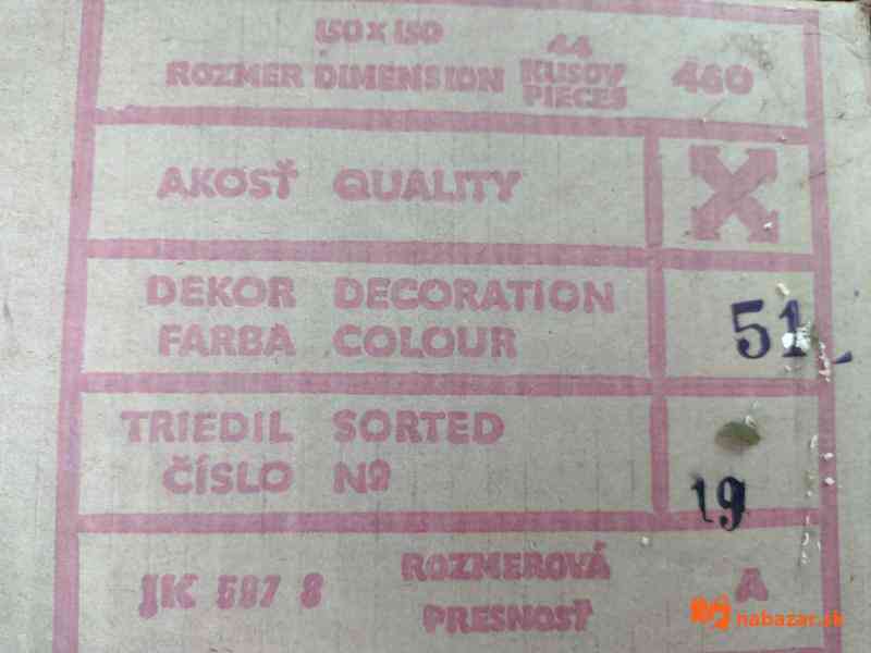 Nové keramické obkladačky s rozmerom 15x15 cm jemne krémovej farby. Cena je 10 € za meter štvorcový. Vzhľadom k hmotnosti a krehkosti si prípadný záujemca musí zabezpečiť osobný odber.