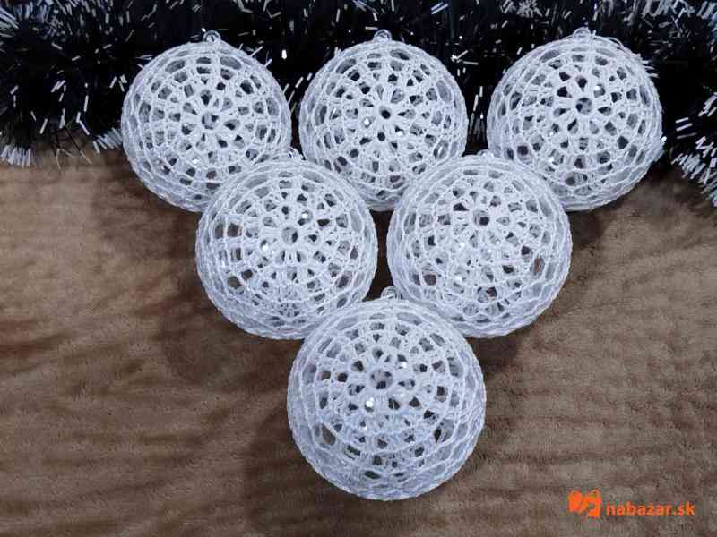 Obháčkovaná priesvitná plastová guľa o priemere 8,5 cm s uškom na zavesenie na vianočný stromček alebo vhodná len ako dekorácia. Cena za 1 kus je 3,-Eur. Doba dodania závisí od počtu požadovaných kusov.