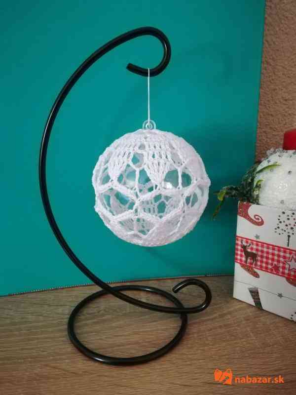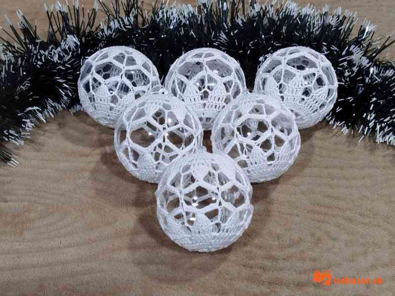 Obháčkovaná priesvitná plastová guľa o priemere 8,5 cm s uškom na zavesenie na vianočný stromček alebo vhodná len ako dekorácia. Cena za 1 kus je 3,-Eur. Doba dodania závisí od počtu požadovaných kusov.