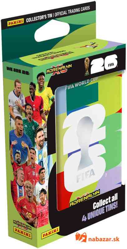 Zberateľské karty FIFA WORLD CUP 2026 - ADRENALYN. V plechovej krabičke je 32 kariet + 3 limitované karty.
