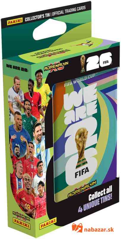 Zberateľské karty FIFA WORLD CUP 2026 - ADRENALYN. V plechovej krabičke je 32 kariet + 3 limitované karty.