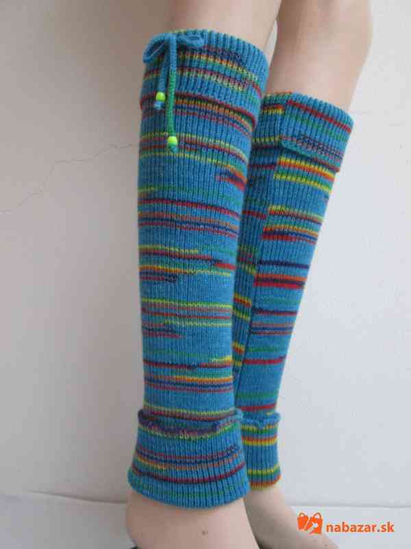 Návleky jsou upleteny pružným vzorem, jsou poddajné. Nahoře je šňůrka na stažení a zároveň návleky zdobí. Na konci šňůrky jsou plastové korálky. Mašlička může být vpředu nebo po straně. Návleky mají šev.